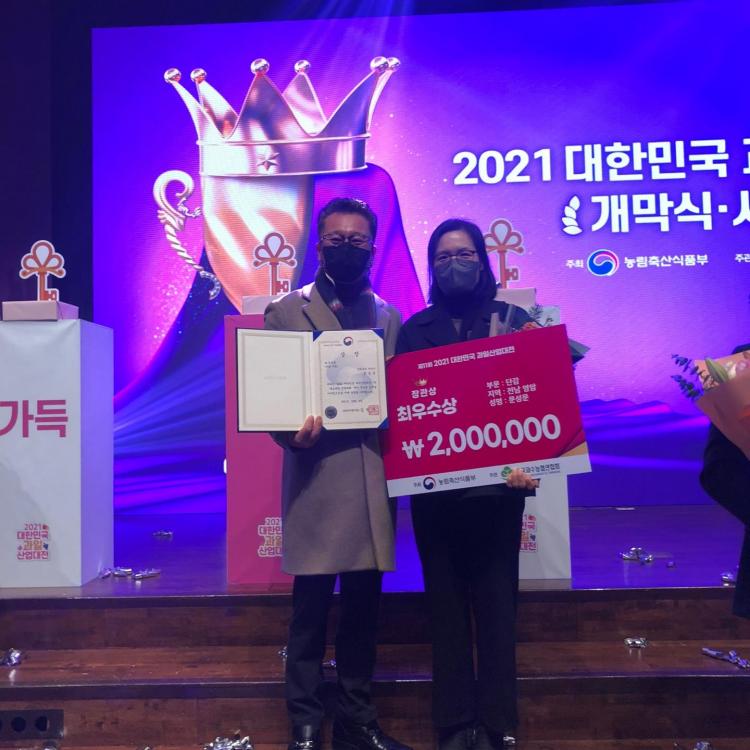 ´ë»ó°úÁ¾¿¡´Â ÀϹݰú¼ö 7°³ ǰ¸ñ(»ç°ú, ¹è, ´Ü°¨, °¨±Ö, Æ÷µµ, º¹¼þ¾Æ, Âü´Ù·¡)°ú »ê¸²°ú¼ö 4°³ ǰ¸ñ(¹ã, È£µÎ, ¶µÀº °¨, ´ëÃß)À» ÃâǰÇÏ¿© °úÁ¾º°·Î °¡Àå ¿ì¼öÇÑ °úÀÏÀ» Æò°¡ ´ë»ó(1¸í), ÃÖ¿ì¼ö»ó(13¸í), ¿ì¼ö»ó(13¸í), Àå·Á»ó(13¸í), Ưº°»ó(6¸í)À» ½Ã»óÇÑ´Ù.