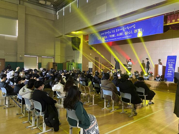 Áö³ 12¿ù 8ÀϺÎÅÍ 2¹Ú 3ÀÏ µ¿¾È Àü³² ¹«¾È ³²¾Ç°íµîÇб³¿¡¼ °í3 Çлýµé°ú ÇÔ²² ÁøÇàÇÑ ¡®¾Ç(äÅ)¼Ò(áÃ)½É(ãý)°æ(Ìí)¡¯ ÇÁ·ÎÁ§Æ®´Â ¼Ò¸®ÆÄµ¿ ޱ¸¸¦ ÅëÇØ ÇлýµéÀÌ ¡®³ªÀÇ ¼Ò¸®¡¯¸¦ ½Ã°¢ÈÇϰí Àڱ⸸ÀÇ ¹æ½ÄÀ¸·Î ÀÚ½ÅÀ» Ç¥ÇöÇÏ´Â °æÇèÀ» Á¦°øÇß´Ù. ÀÌ´Â ¼öÇдɷ ½ÃÇèÀ» Ä¡¸£°í ³ ÇлýµéÀÇ ÇǷΰ¨À» Ç®¾îÁÖ´Â µ¿½Ã¿¡, ÀÏ»óÀÇ »î¿¡ ÇÊ¿äÇÑ ÀÚ±âÇ¥Çö°ú ¼ÒÅë ¿ª·®À» Ű¿ì±â À§ÇÑ °ÍÀÌ´Ù.