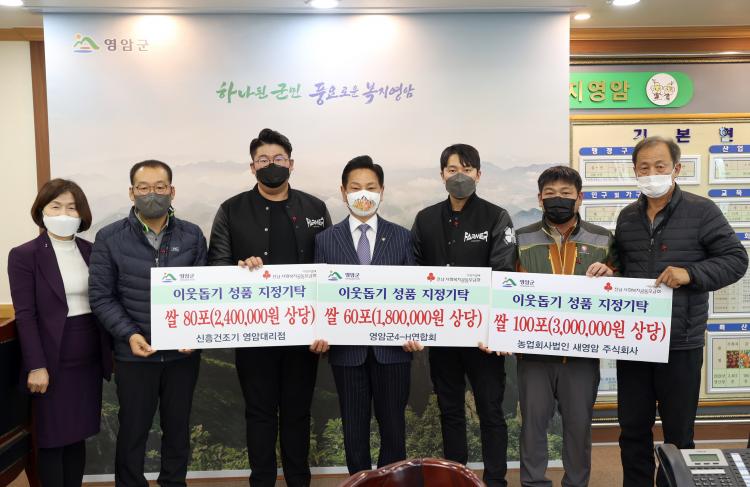 ±âºÎ³»¿ªÀº ³ó¾÷ȸ»ç¹ýÀÎ »õ¿µ¾Ï ÁÖ½Äȸ»ç(°±¤Ãµ ´ëÇ¥)¿¡¼ ½Ò 100Æ÷¸¦ ±âŹÇÏ¿´À¸¸ç, ½ÅÈï°ÇÁ¶±â ¿µ¾Ï´ë¸®Á¡(¾ç¸íÁ÷ ´ëÇ¥)¿¡¼ ½Ò 80Æ÷¸¦, ¿µ¾Ï±º4H-¿¬ÇÕȸ(¹ÚŽ ȸÀå)¿¡¼´Â ½Ò 60Æ÷¸¦ Àú¼Òµæ °¡Á¤À» À§ÇØ ±âŹÇÏ¿´´Ù.