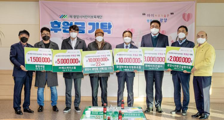 ±âŹ½Ä¿¡´Â ±¤¾ç¿ø¿¹³ó¾÷Çùµ¿Á¶ÇÕ(Á¶ÇÕÀå ÀåÁøÈ£) 1õ¸¸ ¿ø, ±¤¾ç½Ã¹Î(Á¤¿ë°ü) 1õ¸¸ ¿ø°ú CMS 22°èÁÂ, ¢ß¿¡½ºÄÉÀ̽ºÆ¿(´ëÇ¥ ¹Î´ë¼ø) 5¹é¸¸ ¿ø, ¿£¿¡ÀÌÄ¡°Ç¼³(ÁÖ)(´ëÇ¥ Ȳġȯ) 3¹é¸¸ ¿ø, ±¤¾ç½ÃÀü¹®°Ç¼³ÇùÀÇȸ(ȸÀå Á¤¿ìÅÂ) 2¹é¸¸ ¿ø, ¿Õâ±¹¹ä(´ëÇ¥ °º¸¼ø) 150¸¸ ¿øÀ» Àü´ÞÇß´Ù.