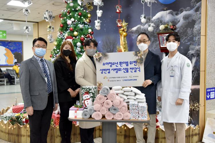 ¼Ò¾ÆÃ»¼Ò³â°ú¿Í »çȸ»ç¾÷ÆÀÀº ÃÖ±Ù(12¿ù24ÀÏ) 1Ãþ ·Îºñ¿Í º´µ¿¿¡¼ ÀÔ¿ø ÁßÀΠȯ¾Æµé¿¡°Ô ¸ñµµ¸®, ¹®È»óǰ±Ç, º¸Á¶¹èÅ͸® µî ¼ºÅº ¼±¹°À» Àü´ÞÇß´Ù.