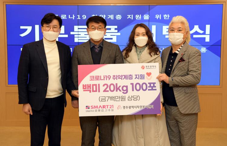 À¯ÇÑȸ»ç ½º¸¶Æ®21Àº Äڷγª19·Î ¾î·Á¿ò¿¡ óÇÑ Ãë¾à°èÃþÀ» Áö¿øÇϱâ À§ÇØ ¹é¹Ì 20§¸ 100Æ÷(700¸¸¿ø »ó´ç)¸¦ (»ç)±¤ÁÖ½ÃÀÚ¿øºÀ»ç¼¾ÅÍ¿¡ Àü´ÞÇß´Ù. Àü´ÞµÈ ¹é¹Ì´Â Äڷγª19·Î ¾î·Á¿î °æ¿µ³ ¼Ó¿¡¼µµ ¡®Ãµ¿ø ¹ä»ó¡¯À¸·Î ¼Ò¿Ü ÀÌ¿ôÀÇ ÁöÅ´ÀÌ ¿ªÇÒÀ» Çϰí ÀÖ´Â µ¿±¸ ´ëÀνÃÀå ³» ¡®Çضߴ ½Ä´ç¡¯°ú 5°³ ±¸ ÀÚ¿øºÀ»ç¼¾Å͸¦ ÅëÇØ Ãë¾à°èÃþ¿¡ Àü´ÞµÉ ¿¹Á¤ÀÌ´Ù.