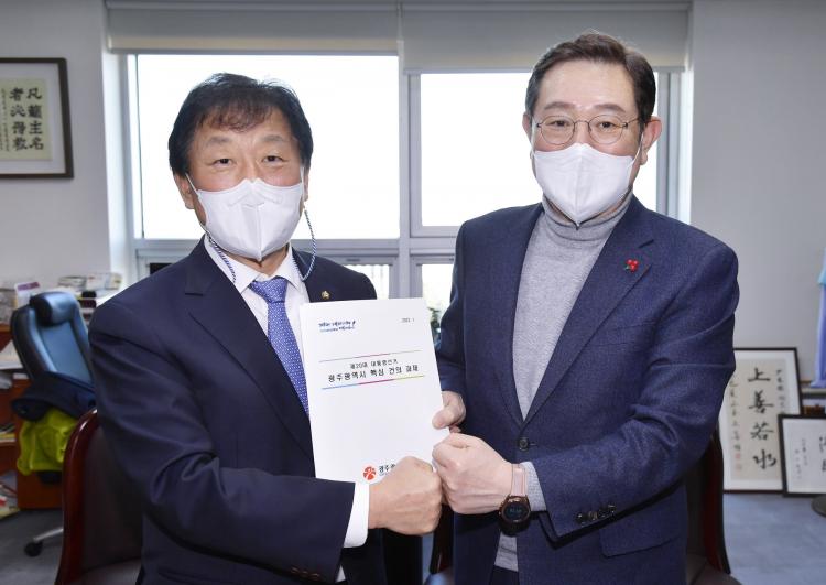 ±¤Áֽô ´ë¼±°ø¾à¿¡ ¹Ý¿µÇØ¾ß ÇÒ ¡®½Ã¹ÎÀÌ ÇູÇÑ ´õ Å©°í ´õ °ÇÑ ¹Ì·¡ ±¤ÁÖ¡¯¸¦ À§ÇÑ °úÁ¦ÀÎ ¡ã±¤ÁÖ¡¤Àü³²ÀÇ »ó»ý°ú µ¿¹Ý¼ºÀåÀ» µµ¸ðÇϱâ À§ÇØ ÀÓ±â Áß ±¤ÁÖ ±º °øÇ× ÀÌÀü ¹®Á¦ ÇØ°á(±¹°¡»ç¾÷È) ¡ã1800¸¸ µ¿¡¤¼ ±¤¿ª °æÁ¦±ÇÀ» ±¸ÃàÇØ Áö¿ª ±ÕÇü¹ßÀüÀ» µµ¸ðÇϱâ À§ÇÑ ±¤ÁÖ-´ë±¸ ´Þºû°í¼Óöµµ Àӱ⠳» Á¶±â Âø°ø(¿¹ºñŸ´ç¼ºÁ¶»ç ¸éÁ¦) ¡ã±¤ÁÖ¿Í ÀÎÁ¢ÇÑ 5°³ ½Ã¡¤±º(³ªÁÖ, ȼø, ´ã¾ç, ÇÔÆò, À强)À» ´ÜÀÏ °æÁ¦±ÇÀ¸·Î ¹¾î ÀΰøÁö´É ±â¹ÝÀÇ ºû°íÀ» ½º¸¶Æ® ¸Þ°¡½ÃƼ·Î Á¶¼º ¡ã¾Æ½Ã¾Æ¹®ÈÁ߽ɵµ½Ã ±¤ÁÖ¸¦ ´ëÇ¥ÇÏ´Â °ø¿¬¿¹¼ú ÀÎÇÁ¶ó È®º¸¸¦ À§ÇÑ ±¤ÁÖ ¾Æ½Ã¾Æ ¾ÆÆ®½ºÄù¾î Á¶¼º µîÀ» ¼³¸íÇϰí ÇùÁ¶¸¦ ¿äûÇß´Ù.