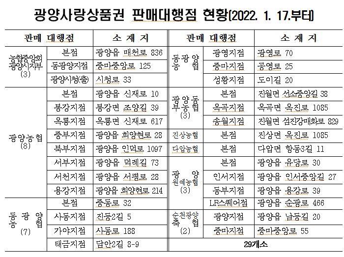½Ã´Â ±¸¸Å ÆíÀǸ¦ À§ÇØ ¼øÃµ±¤¾çÃàÇù°ú Áö³ 7ÀÏ ÆÇ¸Å´ëÇàÁ¡ ¿î¿µ ¾÷¹« ´ëÇà Çù¾àÀ» ü°áÇØ ÃàÇù ±¤¾çÁöÁ¡°ú Á߸¶ÁöÁ¡ÀÌ Ãß°¡µÊÀ¸·Î½á, ¿ÃÇØºÎÅÍ 29°³ ÆÇ¸Å´ëÇàÁ¡¿¡¼ »óǰ±ÇÀ» ±¸¸ÅÇÒ ¼ö ÀÖ´Ù.