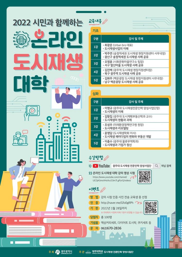 À̹ø ¿Â¶óÀÎ µµ½ÃÀç»ý ´ëÇÐ ÇÁ·Î±×·¥Àº ±¤ÁÖ±¤¿ª½Ã°¡ ÁÖÃÖÇÏ°í ±¤ÁÖ´ë µµ½ÃÀç»ý Àü¹®Àη ¾ç¼º»ç¾÷´ÜÀÌ ÁÖ°üÇØ ÁøÇàµÇ¸ç, ½Ã¹Î ´©±¸³ª °ÀÇ ¿µ»óÀ» ½ÃûÇÒ ¼ö ÀÖ´Ù.