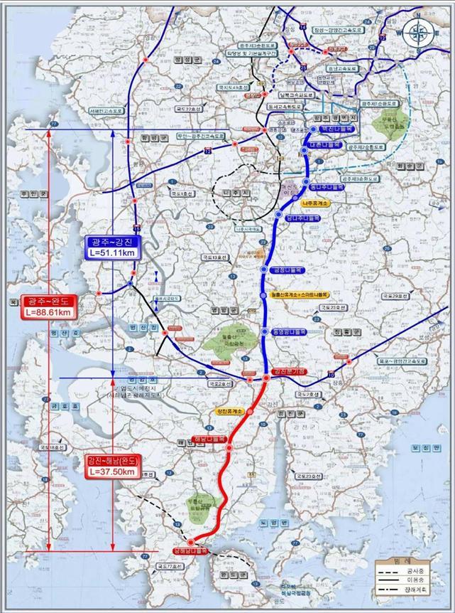 ±¤ÁÖ~¿Ïµµ °í¼Óµµ·Î »ç¾÷Àº ÃÑ¿¬Àå 88.61Km, 4Â÷¼± °í¼Óµµ·Î¸¦ °Ç¼³Çϱâ À§ÇØ ¾à 3Á¶ 3õ¾ï ¿øÀÌ ¼Ò¿äµÇ¸ç, ±¤ÁÖ ¼±¸ º®Áøµ¿~°Áø ¼ºÀü 1´Ü°è(51.11km), °Áø ÀÛõ~ÇØ³² ºÏÆò 2´Ü°è(37.5km)·Î ³ª´©¾î ÃßÁø ÁßÀÌ´Ù.