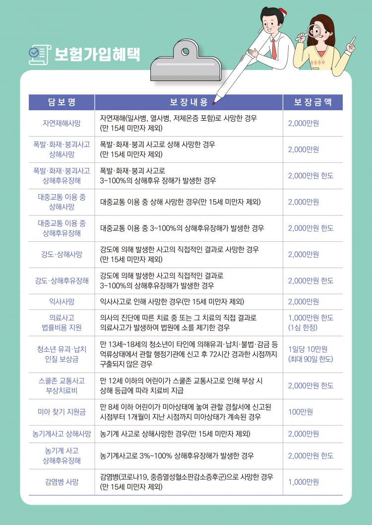 º¸Àå ±Ý¾×Àº »ç¸Á ¹× ÈÄÀ¯ÀåÇØ °¢°¢ 2000¸¸ ¿øÀÌ º¸ÀåµÇÁö¸¸, »ó¹ý Á¦732Á¶¿¡ µû¶ó 15¼¼ ¹Ì¸¸ÀÚ, ½É½Å»ó½ÇÀÚ ¶Ç´Â ½É»ê¹Ú¾àÀÚÀÇ »ç¸ÁÀº º¸ÀåÀ» ¹ÞÀ» ¼ö ¾ø´Ù.