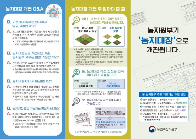 ÇöÇà ³óÁö¿øºÎ´Â ³ó¾÷ÀÎ ±âÁØÀ¸·Î ÀÛ¼ºÇϰí ÀÖÀ¸³ª 2022³â 4¿ù 15ÀϺÎÅÍ´Â ³óÁö ÇÊÁöº° ±âÁØÀ¸·Î ³óÁö´ëÀåÀÌ ÀÛ¼ºµÇ¸ç, ´ã´ç±â°üÀÌ ³ó¾÷ÀÎÀÇ ÁÖ¼ÒÁö¿¡¼ ³óÁö ¼ÒÀçÁö·Î º¯°æµÇ°í, ´ã´ç±â°üÀÌ Á÷±ÇÀ¸·Î ÀÛ¼º¡¤°ü¸®ÇÏ´Â ³óÁö¿øºÎ¿Í ´Þ¸® ½Å°íÁÖÀǸ¦ Àû¿ëÇÑ´Ù.