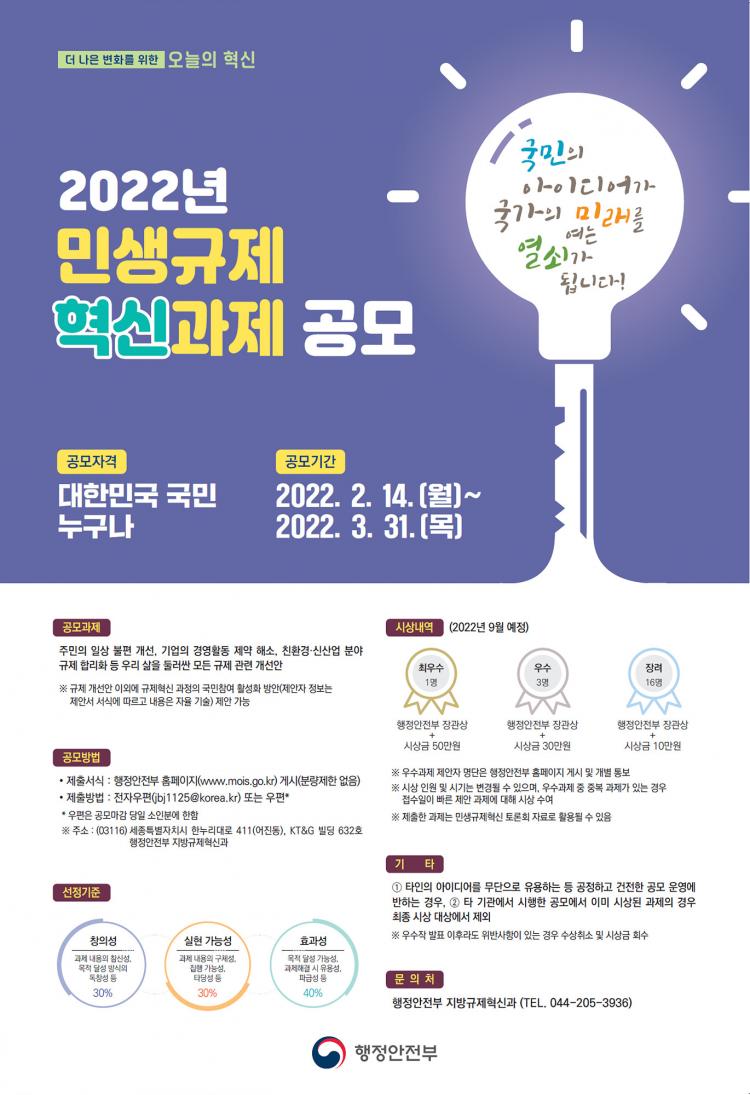À̹ø °ø¸ðÀüÀº ½Ã¹ÎÀÇ ÀÏ»ó»ýȰÀ̳ª ±â¾÷ÀÇ °æ¿µÈ°µ¿¿¡ ºÒÆíÀ» ÁÖ´Â ºÒÇÕ¸®ÇÑ ±ÔÁ¦¸¦ ¹ß±¼Çϰí ÇØ¼ÒÇϱâ À§ÇØ ¡®±¹¹ÎÀÇ ¾ÆÀ̵ð¾î°¡ ±¹°¡ÀÇ ¹Ì·¡¸¦ ¿©´Â ¿¼è°¡ µË´Ï´Ù¡¯´Â ÁÖÁ¦·Î ¿À´Â 3¿ù 31ÀϱîÁö ÁøÇàµÈ´Ù.