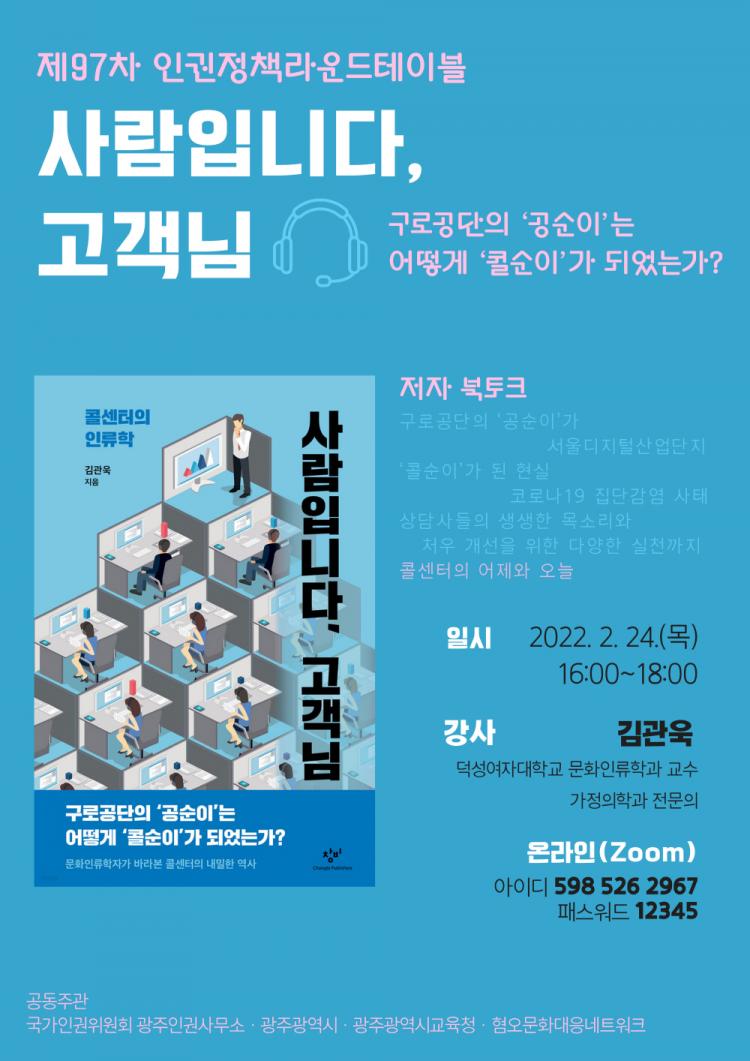 ÇÑÆí Á¦97Â÷¸¦ ¸Â´Â ÀαÇÁ¤Ã¥¶ó¿îµåÅ×À̺íÀº ½Ã±³À°Ã», ½Ãû, ±¤ÁÖÀαǻ繫¼Ò, Çø¿À´ëÀÀ³×Æ®¿öÅ©°¡ °øµ¿À¸·Î ¿î¿µÇÑ´Ù. ÁÖ¿ä À뱂 ÀÇÁ¦³ª Çö¾È¿¡ ´ëÇØ ÇнÀÇϰí Åä·ÐÇÏ´Â °ø·ÐÀÇ ÀåÀ¸·Î °Ý¿ù·Î 1ȸ °³ÃֵȴÙ.