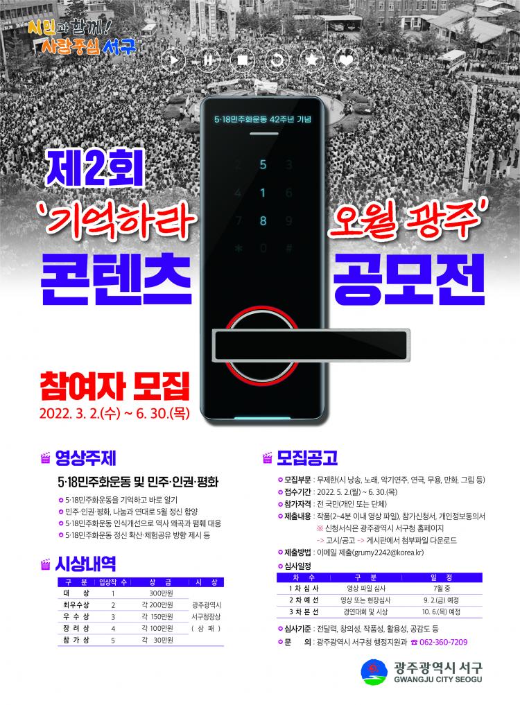°ø¸ð Á¢¼ö´Â 5¡¤18À» ºñ·ÔÇÑ ¹ÎÁÖ¡¤Àαǡ¤Æòȸ¦ ÁÖÁ¦·Î ½Ã ³¶¼Û, ³ë·¡, ¾Ç±â¿¬ÁÖ, ¿¬±Ø, ¹«¿ë, ¸¸È, ±×¸² µîÀ» ÄÜÅÙÃ÷·Î ÇÏ´Â °³ÀÎ ¶Ç´Â ´Üü(10ÀÎ À̳»)°¡ Âü¿© °¡´ÉÇϸç, Áߺ¹ Á¢¼ö´Â ºÒ°¡ÇÏ´Ù.
