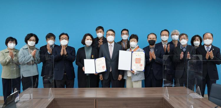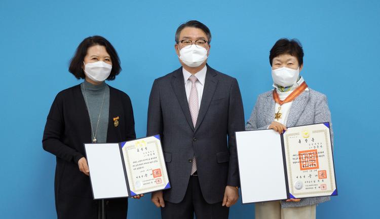 À̳¯ °£¹®ÀÚ ±³¼ö´Â 41³â°£ ±³´Ü¿¡¼ ÈÄÇÐÀ» ¾ç¼ºÇØ ¿Â °ø·Î·Î ȲÁ¶±ÙÁ¤ÈÆÀåÀ», ¹Ú»ó·É ±³¼ö´Â 30³â°£ °´Ü¿¡¼ ±³À°¿¡ Àü³äÇØ ±ÙÁ¤Æ÷ÀåÀ», À̼÷Èñ ±³¼ö´Â 29³â µ¿¾È ÈÄÁø ¾ç¼º¿¡ ÈûÀ» ½ñÀº °ø·Î·Î ´ëÅë·É ǥâÀ» °¢°¢ Àü¼ö ¹Þ¾Ò´Ù. ¶Ç 39³â°£ ÈÄÇо缺¿¡ Èû½á¿À¸é¼, ±âȹóÀå, ÀÔÇÐóÀå, Àι®»çȸ´ëÇÐÀå, ´ëÇпøÀå µî ÁÖ¿ä º¸Á÷ ¸Ã¾Æ Çб³¹ßÀü¿¡ À̹ÙÁöÇØ¿Â ±èÇѹè(ÇàÁ¤Çаú) ±³¼ö´Â °ø·ÎÆÐ¸¦ ¼ö»óÇß´Ù.