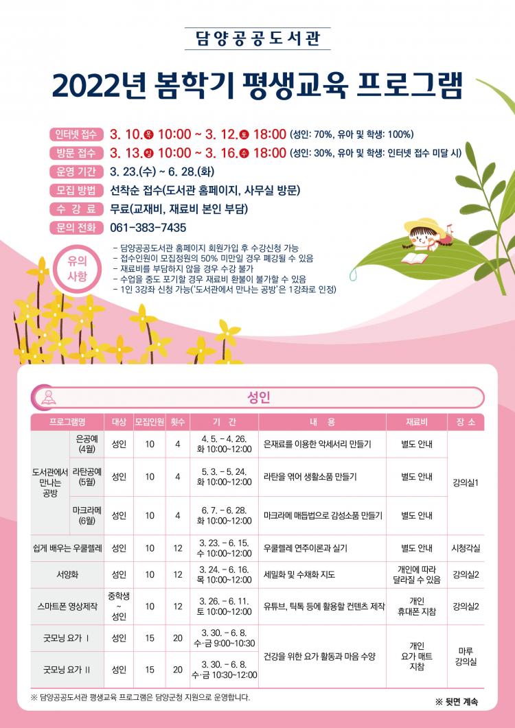 ¸ðµç °Á ¼ö°·á´Â ¹«·áÀ̸ç Àç·áºñ ¹× ±³Àçºñ´Â º»ÀÎ ºÎ´ãÀÌ´Ù. ±âŸ ÀÚ¼¼ÇÑ »çÇ×Àº ´ã¾ç°ø°øµµ¼°ü ´©¸®Áý(dylib.jne.go.kr)¿¡¼ È®ÀÎÇϰųª Æò»ý±³À°´ã´çÀÚ(061-383-7435)¿¡°Ô ¹®ÀÇÇÏ¸é µÈ´Ù.