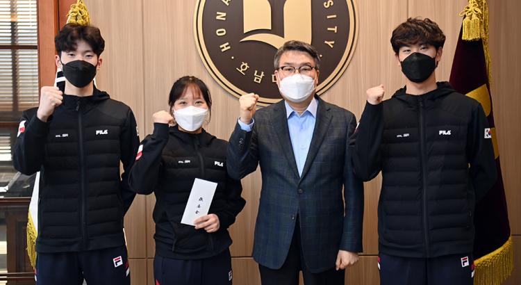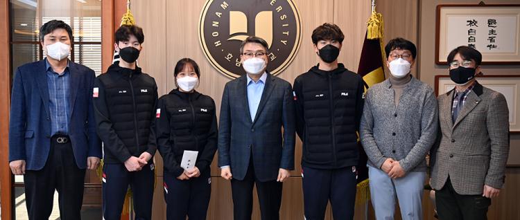 [ÅåÅå´º½º]¹Ú»óö È£³²´ëÇб³ ÃÑÀåÀº 3¿ù 29ÀÏ ÃÑÀå½Ç¿¡¼ ¡®2022¼¼°èû¼Ò³âÆæ½Ì¼±¼ö±Ç´ëȸ¡¯¿¡ ÃâÀüÇÏ´Â ½ºÆ÷Ã÷·¹ÀúÇаú 2Çг⠱èÀ¯¹Î, ¹ÚÁ¤È£, ¹ÚÅ¿µ ¼±¼öÀÇ ¼±ÀüÀ» ´çºÎÇÏ¸ç °Ý·Á±ÝÀ» Àü´ÞÇß´Ù.