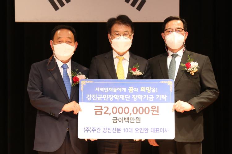 ¿ÀÀÎȯ ´ëÇ¥ÀÌ»ç´Â ¡°¢ß°Áø½Å¹® ´ëÇ¥ÀÌ»ç ÃëÀÓÀ» ¸Â¾Æ ¹Ì·¡ ÁÖ¿ªÀÎ Áö¿ª ÇлýµéÀÌ ²ÞÀ» À§ÇØ ÈûÂ÷°Ô µµ¾àÇÏ°í ¼ºÀåÇÏ´Â µ¥ Á¶±ÝÀ̳ª¸¶ µµ¿òÀÌ µÇ±æ ¹Ù¶ó´Â ¸¶À½À¸·Î ÀåÇбÝÀ» Àü´ÞÇß´Ù¡±¸ç ¡°°Áø½Å¹®µµ Áö¿ª ÇлýµéÀÌ ²ÞÀ» ÀÌ·ê ¼ö ÀÖµµ·Ï ³ë·ÂÇϰڴ١±°í ¹àÇû´Ù.