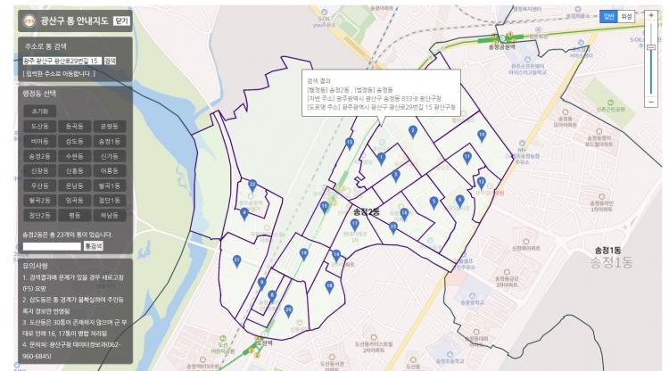 ±¤»ê±¸ Åë ¾È³»Áöµµ´Â ±¤»ê±¸ °ø°øµ¥ÀÌÅÍ Ç÷§Æû ±¤»êimap(imap.gwangsan.go.kr)¿¡¼ È®ÀÎÇÒ ¼ö ÀÖ´Ù. ¸Þ´º³ª ÁöµµÀÇ ÇàÁ¤µ¿ À̸§À» Ŭ¸¯Çϰųª ÇØ´ç ÁÖ¼Ò¸¦ ÀÔ·ÂÇϸé ÇàÁ¤µ¿, ¹ýÁ¤µ¿, Åë ¹øÈ£ µî ´Ù¾çÇÑ Á¤º¸¸¦ Á¦°øÇÑ´Ù.