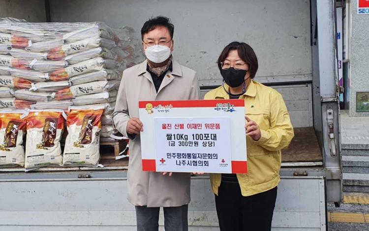 [ÅåÅå´º½º]¹ÎÁÖÆòÈÅëÀÏÀÚ¹®È¸ÀÇ ³ªÁÖ½ÃÇùÀÇȸ(ȸÀå ÃÖÁ¾¼®)´Â Áö³ ´Þ °æºÏ ¿ïÁø¿¡¼ ¹ß»ýÇÑ ´ëÇü»êºÒ·Î ÇÇÇØ¸¦ ÀÔÀº ÀÌÀç¹ÎÀ» À§ÇÑ ½Ò 100Æ÷(300¸¸¿ø »ó´ç)¸¦ ¹ÎÁÖÆòÈÅëÀÏÀÚ¹®È¸ÀÇ ¿ïÁø±ºÇùÀÇȸ¸¦ ÅëÇØ ¿ïÁø±º¿¡ Àü´ÞÇß´Ù°í 4ÀÏ ¹àÇû´Ù.