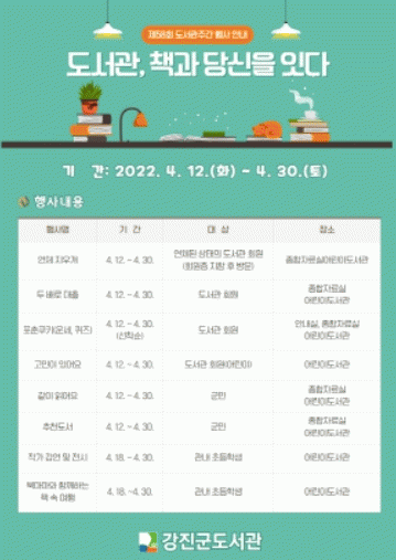¸Å³â Àü±¹ °¢ ÁöÀÚü µµ¼°ü¿¡¼ ¿î¿µÇÏ´Â µµ¼°üÁÖ°£Àº µµ¼°ü ÀÌ¿ëÀڵ鿡°Ô µ¶¼¸¦ ±ÇÀåÇÏ´Â ´Ù¾çÇÑ Çà»ç¸¦ ¸¶·ÃÇØ µ¶¼¹®È¸¦ È®»êÇÏ°í µµ¼°ü ÀÌ¿ë Ȱ¼ºÈ¸¦ À¯µµÇϱâ À§ÇØ ÃßÁøÇϰí ÀÖ´Â Çà»çÀÌ´Ù.