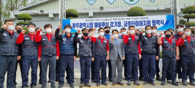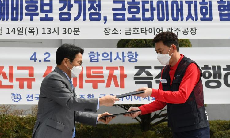 ÀÓ±æÅà ±ÝȣŸÀÌ¾î ´ëÇ¥ÁöȸÀåÀº ¡°±×µ¿¾È ³ëÁ¶¿Í ȸ»ç°¡ ±¤Áֽÿ¡ ¿©·¯Â÷·Ê ¹®Á¦ÇذáÀ» À§ÇÑ ³íÀǸ¦ ¿äûÇßÀ¸³ª ÇØ°áµÇÁö ¾Ê¾Ò´Ù¡±¸ç ¡°À̹ø Çù¾àÀº ´äº¸»óÅ¿¡ ÀÖ´Â ±¤ÁÖ°øÀå ÀÌÀü ¹®Á¦ ÇØ°áÀ» À§ÇÑ Ãâ¹ßÁ¡ÀÌ´Ù¡±°í ¸»Çß´Ù.