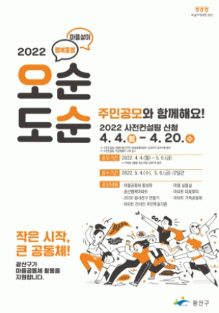 ÇÑÆí, ¡®2022³â ¿À¼øµµ¼ø ¸¶À»»ìÀÌ Çູµ¿Ç࡯ Áֹΰø¸ð °èȹ¼´Â 5¿ù4ÀϺÎÅÍ 6ÀϱîÁö Á¢¼öÇϸç, ½ÅûÀ» Èñ¸ÁÇÏ´Â ÁֹΠ¸ðÀÓ, °øµ¿Ã¼ µîÀº ¸¶À»¹è¿òÅÍ ±³À°À» À̼öÇÑ µÚ »çÀüÄÁ¼³ÆÃÀ» °ÅÃÄ¾ß ÇÑ´Ù. ¸¶À»¹è¿òÅÍ ±³À°Àº ±¤»ê±¸, ±¤»ê±¸ µµ½ÃÀç»ý°øµ¿Ã¼¼¾ÅÍ À¯Æ©ºê ä³Î¿¡¼ ¼ö°ÇÒ ¼ö ÀÖ´Ù.
