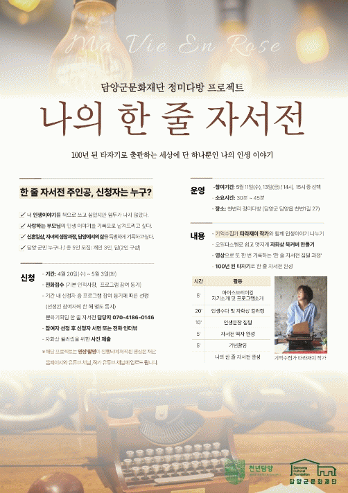 ¡®³ªÀÇ ÇÑ ÁÙ ÀÚ¼Àü¡¯Àº ´ã¾çÀÇ ÁÖ¹ÎÀ» À§ÇØ ¿î¿µµÇ´Â Á¤¹Ì´Ù¹æ¿¡¼ ÁÖ¹ÎÀÇ À̾߱⸦ ÇÑ ÁÙÀÇ ½Ã·Î ¼±¹°ÇÏ´Â Á¤¹Ì´Ù¹æÀÇ ÇÁ·ÎÁ§Æ®·Î, ±â¾ï¼öÁý°¡ ¡®Å¸¶óÀçÀÌ¡¯ ÀÛ°¡¿Í ÇÔ²² ¼ÒÅëÇÏ´Â ¹æ½ÄÀ¸·Î ÁøÇàµÈ´Ù.