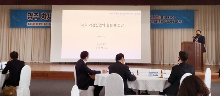 [ÅåÅå´º½º]È£³²´ëÇб³ ¾ç½ÂÇÐ ±³¼ö(Àü±â°øÇаú)´Â 4¿ù 22ÀÏ ¿ÀÈÄ ±¤ÁÖ°úÇбâ¼úÁøÈï¿ø ±¹Á¦È¸ÀÇÀå¿¡¼ ¿¸° ¡®±¤ÁÖ Â÷¼¼´ë °¡Àü»ê¾÷ À°¼º¹æ¾È ±â¼úÆ÷·³¡¯¿¡¼ ±¤ÁÖÁö¿ª °¡Àü»ê¾÷ ÇöȲ°ú Àü¸Á¿¡ ´ëÇÑ ÁÖÁ¦¹ßÇ¥¸¦ ÁøÇàÇß´Ù.