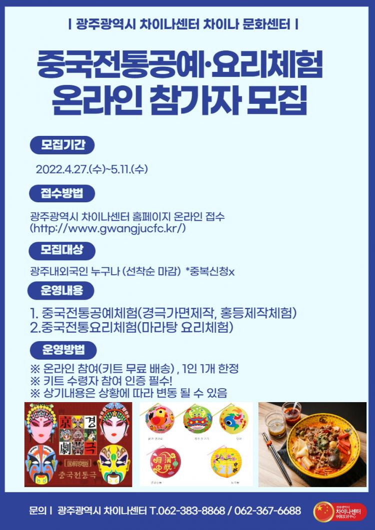[ÅåÅå´º½º]±¤ÁÖ±¤¿ª½Ã Â÷À̳ª¼¾ÅÍ(¼¾ÅÍÀå Á¶°æ¿Ï È£³²´ë ±³¼ö)´Â ¿À´Â 5¿ù 11ÀϱîÁö ±¤Áֽùεé°ú À籤 Áß±¹ÀεéÀ» ´ë»óÀ¸·Î Â÷À̳ª ¹®È¼¾ÅÍ ¡®Áß±¹ÀüÅë°ø¿¹¡¤¿ä¸® üÇ衯 ¿Â¶óÀÎ Âü°¡ÀÚ¸¦ ¸ðÁýÇÑ´Ù.