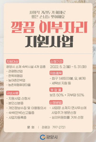 Àü¶ó³²µµ-±¤¾ç½Ã º¸Á¶»ç¾÷À¸·Î ÃßÁøÇÏ´Â ±ò²û À̺ÎÀÚ¸® Áö¿øÀº Áö¿ª ³» ¼÷¹Ú¾÷ü¿¡ ħ±¸·ù¸¦ º¸±ÞÇϰí, Çѹø »ç¿ëÇÑ Ä§±¸·ù´Â À§»ý ¾ÈÀüÀ» À§ÇØ ¼¼Å¹ÇØ »ç¿ëÇϵµ·Ï ¼¼Å¹ºñ¸¦ Áö¿øÇÏ´Â »ç¾÷ÀÌ´Ù.