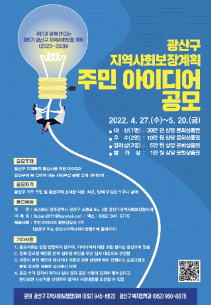 À̹ø °ø¸ð´Â ±¤»ê±¸ Áö¿ªº¹Áö Ȱ¼ºÈ¸¦ À§ÇÑ ¾ÆÀ̵ð¾î, ±¤»ê±¸¿¡ ²À ÀÖ¾î¾ß ÇÏ´Â »çȸº¸Àå °ü·Ã Á¤Ã¥ ¾ÆÀ̵ð¾î¸¦ ´ë»óÀ¸·Î ÇÑ´Ù.