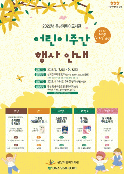 ±¤»ê±¸ ¿î³²¾î¸°À̵µ¼°üÀº 5¿ù1ÀϺÎÅÍ 7ÀϱîÁö ¡®¾î¸°ÀÌÁÖ°£¡¯ Çà»ç¸¦ ÁøÇàÇÑ´Ù. ±è¼º¹Ì ÀÛ°¡ÀÇ ¡®µÅÁö²Þ¡¯ ±×¸²Ã¥ ¾ÆÆ®ÇÁ¸°ÆÃ Àü½Ã¿Í ÇÔ²² ¡®¼ÒÁßÇÑ ²ÞÀÌ ²ÞƲ²ÞƲ¡¯ µå¸²Ä³ÃÄ ¸¸µé±â, ¡®³» ¸¶À½ ¾Ë¾Æ¿ä¡¯ °¨Á¤ÀÎÇü ¸¸µé±â µî ¾î¸°ÀÌ ´ë»ó µ¶¼Ã¼Çè ÇÁ·Î±×·¥µµ ¿î¿µÇÑ´Ù.