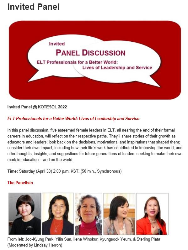 [ÅåÅå´º½º]È£³²´ëÇб³ ¿µ¾îÇаú(ÇаúÀå ±è¹Ì·É) ¹ÚÁÖ°æ ±³¼ö´Â 4¿ù 30ÀÏ~5¿ù 1ÀÏ ¿Â¶óÀÎÀ¸·Î °³ÃÖµÈ 2022³âµµ KOTESOL(´ëÇÑ¿µ¾î±³À°ÇÐȸ) ±¹Á¦ Çмú´ëȸ ÃÊû ÆÐ³Î ÅäÀÇ¿¡ Âü°¡ÇØ ¡°ELT Professional for a Better World: Lives of Leadership & Service (¿µ¾î±³À°Àü¹®°¡ÀÇ ´õ ³ªÀº ¼¼»ó ¸¸µé±â: ¸®´õ½Ê°ú ºÀ»çÀÇ »î)¸¦ ÁÖÁ¦·Î ¹ßÇ¥¿Í Åä·ÐÀ» ÁøÇàÇß´Ù.