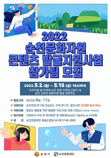 ¡®2022 ¼øÃµ¹®ÈÀÚ¿ø ¹ß±¼»ç¾÷¡¯Àº Áö¿ªÀÇ ¿ª»ç ¹× À̽´ÀÇ ¹ß±¼°ú ±â·Ï, »ç¶óÁ®°¡´Â Áö¿ª °íÀ¯ÀÇ ¹®ÈÀû °¡Ä¡¸¦ Àç¹ß°ßÇÏ´Â ¿¬±¸¸¦ Áö¿øÇÏ´Â »ç¾÷À¸·Î, ¼øÃµ °íÀ¯ÀÇ ¹®È¡¤¿¹¼ú¡¤»ýÅ¡¤¿ª»ç µî Àι®¡¤»çȸÀû ÄÜÅÙÃ÷¸¦ ¹ß±¼ÇÏ¿© Áö¿ªÇÐÀÇ Åä´ë¸¦ ¸¶·ÃÇϰí Áö¿ª ³» °øµ¿Ã¼ ¸ðÀÓÀÇ È°¼ºÈ¸¦ µµ¸ðÇϰíÀÚ ÇÏ´Â »ç¾÷ÀÌ´Ù.