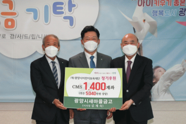 À̳¯ ±âŹ½Ä¿¡´Â ±¤¾ç½Ã »õ¸¶À»±Ý°í(ÀÌ»çÀå ±èÀç¼÷)¿¡¼ ¿µ¡¤À¯¾Æ±â ¾î¸°À̸¦ À§ÇÑ º¸À°»ç¾÷¿¡ »ç¿ëÅä·Ï Á¤±âÈÄ¿ø CMS 1,400°èÁÂ(¿¬°£ 5,040¸¸¿ø »ó´ç)¸¦ Àü´ÞÇß´Ù.