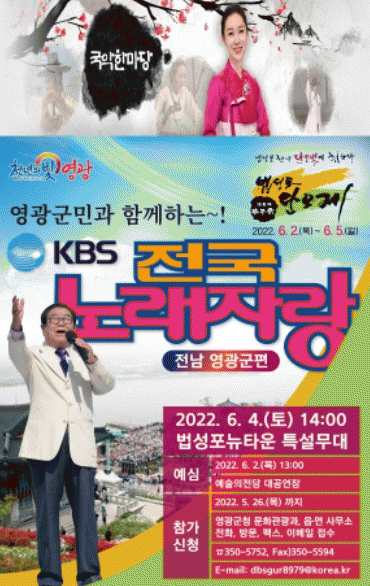 ´ëÇѹα¹ ÃÖÀå¼ö ±¹¹Î À½¾Ç ÇÁ·Î±×·¥ÀÎ Àü±¹³ë·¡ÀÚ¶ûÀº ¹ý¼ºÆ÷´ºÅ¸¿î Ư¼³¹«´ë¿¡¼ 6¿ù 4ÀÏ 14½ÃºÎÅÍ ³ìȰ¡ ÁøÇàµÇ¸ç ¹èÀÏÈ£, Áø¼º, ±èÇý¿¬, Àå¹ÎÈ£, ¼³ÇÏÀ± µî ÃÊ´ë°¡¼öµéÀÇ ÃàÇϰø¿¬µµ ¸¶·ÃµÇ¾î ÀÖ´Ù. ƯÈ÷ À̹ø ³ìÈ´Â Äڷγª19 °Å¸®µÎ±â ÇØÁ¦ ÀÌÈÄ ÃÖÃÊÀÇ ¾ß¿Ü³ìȶó »ó¡¼ºÀ» ´õÇÑ´Ù. ¿¹½ÉÀº 6¿ù 2ÀÏ 13½ÃºÎÅÍ ¿µ±¤¿¹¼úÀÇÀü´ç ´ë°ø¿¬Àå¿¡¼ ¿¸®°í ¿¹½É¿¡ Âü°¡ÇϰíÀÚ ÇÏ´Â ¿µ±¤±º¹ÎÀº ±ºÃ» ¹®È°ü±¤°ú, °¢ À¾¡¤¸é »ç¹«¼Ò¿¡ 5¿ù 26ÀϱîÁö ½ÅûÇÏ¸é µÈ´Ù.