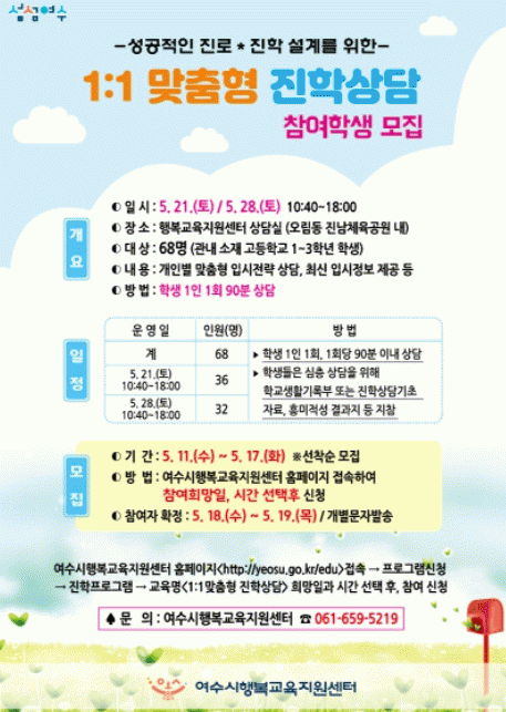 À̹ø »ó´ãÀº ¿À´Â 21Àϰú 28ÀÏ Åä¿äÀÏ ¿ÀÀü 10½Ã 40ºÐºÎÅÍ ¿ÀÈÄ 6½Ã±îÁö ¿©¼ö½Ã Çູ±³À°Áö¿ø¼¾ÅÍ »ó´ã½Ç¿¡¼ ÁøÇàµÈ´Ù.