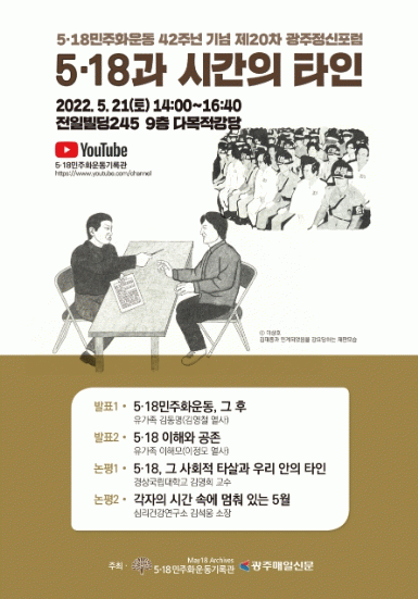 2ºÎ¿¡¼´Â ¡®5¡¤18, ±× »çȸÀû Ÿ»ì°ú ¿ì¸® ¾ÈÀÇ Å¸ÀΡ¯À̶ó´Â ÁÖÁ¦·Î ±è¸íÈñ °æ»ó±¹¸³´ëÇб³ »çȸÇаú ±³¼ö¿Í ±è¼®¿õ ½É¸®°Ç°¿¬±¸¼Ò ¼ÒÀåÀÌ °¢ÀÚÀÇ ½Ã°£ ¼Ó¿¡ ¸ØÃçÀÖ´Â 5¿ùÀ» ÁÖÁ¦·Î ³íÆòÇÑ´Ù.