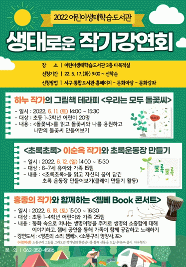 ÀÛ°¡ °¿¬È¸ ÀÏÁ¤Àº ¡ã6¿ù11ÀÏ ÇÏ´© ÀÛ°¡ÀÇ ±×¸²Ã¥ Å×¶óÇÇ '¿ì¸®´Â ¸ðµÎ µ¹²É¾¾' ¡ã6¿ù12ÀÏ 'ÃÊ·ÏÃÊ·Ï' À̼ø¿Á ÀÛ°¡¿Í ÃʷϿÀå ¸¸µé±â ¡ã6¿ù18ÀÏ È«Á¾ÀÇ ÀÛ°¡¿Í ÇÔ²²ÇÏ´Â 'Áªº£ Book ÄܼƮ' ¼ø¼·Î 2Ãþ ´Ù¸ñÀû½Ç¿¡¼ ÁøÇàµÈ´Ù.