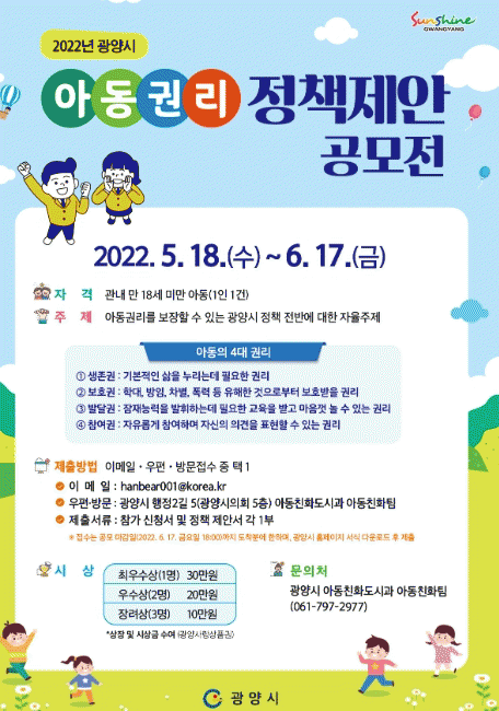 °ø¸ð ÁÖÁ¦´Â ¾Æµ¿±Ç¸®(¡â»ýÁ¸±Ç ¡âº¸È£±Ç ¡â¹ß´Þ±Ç ¡âÂü¿©±Ç)¸¦ º¸ÀåÇÒ ¼ö ÀÖ´Â ±¤¾ç½Ã Á¤Ã¥ Àü¹Ý¿¡ ´ëÇÑ ÀÚÀ²ÁÖÁ¦·Î ÁøÇàµÇ¸ç, ±¤¾ç½Ã °ÅÁÖ ¸¸ 18¼¼ ¹Ì¸¸ÀÎ ¾Æµ¿ÀÌ¸é ´©±¸³ª Âü¿©ÇÒ ¼ö ÀÖ´Ù.