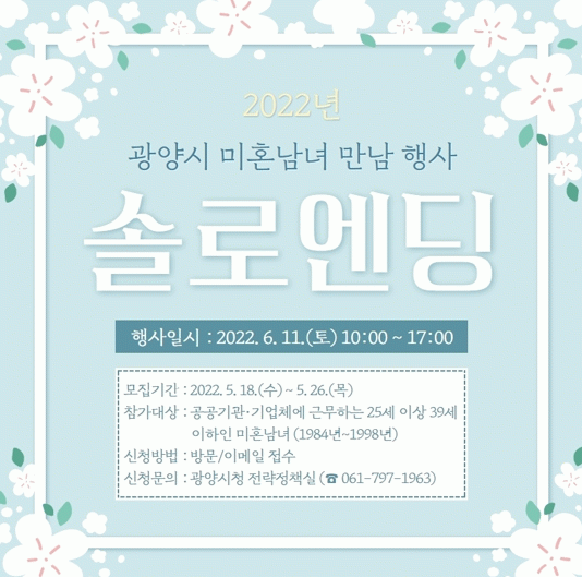 ¡®±¤¾ç ¼Ö·Î¿£µù¡¯Àº ¹Ù»Û ÀÏ»ó°ú Äڷγª19 Àå±âÈ µîÀ¸·Î À̼ºÀ» ¸¸³¯ ±âȸ¸¦ ¸¸µéÁö ¸øÇÑ ¹ÌÈ¥ ³²³à¿¡°Ô °ÇÀüÇÑ ¸¸³²ÀÇ ±âȸ¸¦ Á¦°øÇϰí, °áÈ¥ Ä£ÈÀûÀÎ ºÐÀ§±â Á¶¼ºÀ» À§ÇØ ¸¶·ÃÇÏ´Â Çà»çÀÌ´Ù.