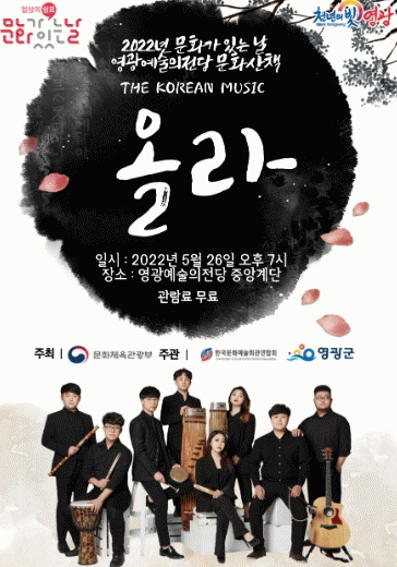 À̹ø °ø¿¬Àº Çѱ¹¹®È¿¹¼ú¿¬ÇÕȸÀÇ 2022³â Áö¿ª¹®È¿¹¼úȸ°ü ¹®È°¡ ÀÖ´Â ³¯ Áö¿ø °ø¸ð»ç¾÷À¸·Î ¼±Á¤µÈ °ø¿¬À̸ç, ¹®ÈüÀ°°ü±¤ºÎ¿¡¼ ÁÖÃÖÇϰí Çѱ¹¹®È¿¹¼úȸ°ü¿¬ÇÕȸ¿Í ¿µ±¤±º¿¡¼ ÁÖ°üÇÑ´Ù. °ü¶÷·á´Â ¹«·áÀÌ¸ç ¿µ±¤¿¹¼úÀÇÀü´ç ¾ß¿Ü°ø¿¬Àå(Áß¾Ó°è´Ü)À» ã¾Æ¿À½Ã¸é ´©±¸³ª °ü¶÷ÇÒ ¼ö ÀÖ´Ù.