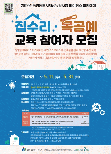 À̹ø ±³À°Àº ¡®Áý¼ö¸® Çб³¡¯¿Í ¡®¸ñ°ø¿¹ Çб³¡¯ 2°³ °úÁ¤À¸·Î ³ª´² ÁøÇàµÈ´Ù. ¸ðÁý ÀοøÀº °¢ °úÁ¤´ç 20¸íÀ¸·Î µ¿¸íµ¿ µµ½ÃÀç»ý »ç¾÷Áö ³» ÁÖ¹ÎÀ» ¿ì¼± ¼±¹ß ÈÄ µ¿±¸ ÁÖ¹ÎÀ¸·Î È®´ëÇÒ ¿¹Á¤ÀÌ¸ç ±³À°ºñ´Â Àü¾× ¹«·áÀÌ´Ù.