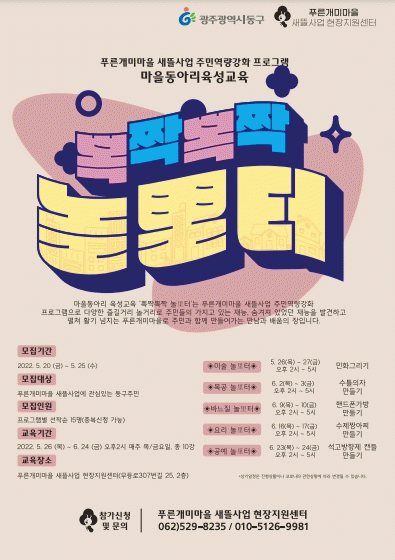 ¡®»È¦»È¦ ³î×ìÅÍ¡¯´Â ¸¶À» °øµ¿Ã¼¸¦ ±â¹ÝÀ¸·Î ÀÚ¹ßÀûÀ¸·Î ¸¶À» ³» ÀÚ¿ø°ú ÁֹΠÁ¶Á÷À» ¹ß±¼ÇØ µ¿¾Æ¸® ±¸¼º¡¤È°µ¿À» Áö¿øÇÏ´Â ÇÁ·Î±×·¥À¸·Î ¡ã¹Ì¼ú ¡ã¸ñ°ø ¡ã¿ä¸® ¡ã¹Ù´ÀÁú ¡ã°ø¿¹ µî ´Ù¾çÇÑ ºÐ¾ßÀÇ ±³À°À¸·Î ¿î¿µÇÒ °èȹÀÌ´Ù.