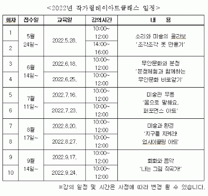 ¸ÅÁÖ Åä¿äÀÏ 2½Ã°£ µ¿¾È ¿î¿µµÇ´Â ÀÛ°¡¸±·¹ÀÌ ¾ÆÆ®Å¬·¡½º´Â ÇöÀç Ȱ¹ßÈ÷ Ȱµ¿Çϰí ÀÖ´Â Àú¸íÇÑ ¹Ì¼úÀÛ°¡¿Í °¢ ºÐ¾ßÀÇ Àü¹® °»ç¸¦ ÃʺùÇØ ±×µ¿¾È ¹Ì¼ú¼ö¾÷°ú´Â ´Ù¸¥ À½¾Ç, ¹«¿ë, ¿ª»ç, ȯ°æ µîÀ» ¹Ì¼ú°ú Á¢¸ñ½ÃŰ´Â âÀÇÀûÀÎ À¶?º¹ÇÕ ¹Ì¼ú±³À° ÇÁ·Î±×·¥À¸·Î °ü³» ¾î¸°À̵鿡°Ô ¼öÁØ ³ôÀº ¿¹¼ú±³À°À» Á¦°øÇÒ ¿¹Á¤ÀÌ´Ù.