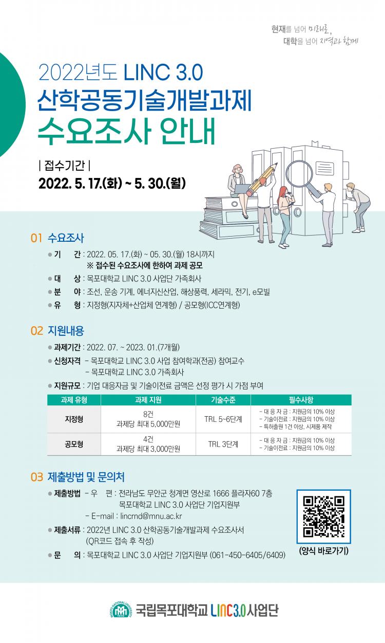 À̹ø ¼ö¿äÁ¶»ç¸¦ ÅëÇØ ¼±Á¤µÈ °úÁ¦¸¦ ´ë»óÀ¸·Î ¡®2022³â LINC 3.0 »êÇаøµ¿±â¼ú°³¹ß°úÁ¦¡¯ °ø¸ð¸¦ ÁøÇàÇÏ¸ç »ç¾÷ºñ´Â ±¹°íÁö¿ø±Ý ÃÖ´ë 5,000¸¸¿ø°ú »ê¾÷ü ´ëÀÀ ÀÚ±ÝÀ¸·Î Áö¿øµÈ´Ù.