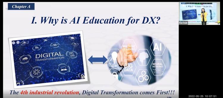 ¹é¶õ ±³¼ö´Â µðÁöÅÐ Àüȯ¿¡ µû¸¥ »ê¾÷ÇöÀåÀ» ºÐ¼®Çϰí ÀΰøÁö´É ±â¼úÀÇ ¹è°æ°ú ±â¼ú¹ßÀü, 4Â÷»ê¾÷Çõ¸í½Ã´ë ´Ù¾çÇÑ ½Å±â¼úÀÇ µîÀå Çö»óÀ» ºÐ¼®Çß´Ù. ƯÈ÷ ÀΰøÁö´É °¢ ¿µ¿ª¿¡¼ ÃÖ÷´Ü ¿¬±¸Àڵ鿡°Ôµµ ÀΰøÁö´É±â¼úÀÇ Çʿ伺¿¡ ´ëÇØ °Á¶ÇßÀ¸¸ç, Why is AI Education for DX¿Í What is AI EducationÀÇ ÁÖÁ¦¿¡ ´ëÇÑ ÀΰøÁö´É±â¼úÀÇ ÇöÁÖ¼Ò¸¦ Á¶¸íÇß´Ù.