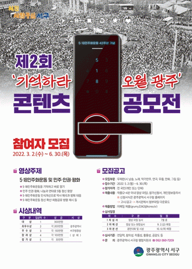 À̹ø °ø¸ðÀüÀº 5¡¤18¹ÎÁÖȿ¿¡ ´ëÇÑ Àü ±¹¹ÎÀÇ ±â¾ï°ú °ü½Éµµ¸¦ ³ôÀ̱â À§ÇØ ¸¶·ÃµÇ¾úÀ¸¸ç °ø¸ð ³»¿ëÀº 5¡¤18À» ºñ·ÔÇÑ ¹ÎÁÖ¡¤Àαǡ¤Æòȸ¦ ÁÖÁ¦·Î ½Ã ³¶¼Û, ³ë·¡, ¾Ç±â¿¬ÁÖ, ¿¬±Ø, ¹«¿ë, ¸¸È, ±×¸² µî °³ÀÎ ¶Ç´Â ´Üü(10ÀÎÀ̳»)·Î Âü¿©°¡ °¡´É ÇÏÁö¸¸ Áߺ¹ Á¢¼ö´Â ÇÒ ¼ö ¾ø´Ù.