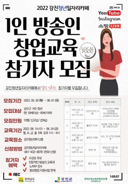 ±³À°Àº 6¿ù 15ÀϺÎÅÍ 24ÀϱîÁö ÁÖ 2~3ȸ ÃÑ 5ȸ °úÁ¤ÀÌ¸ç ¼ö°·á´Â ¹«·áÀÌ´Ù. ¸ðÁý ´ë»óÀº ¸¸18¼¼ ÀÌ»ó 49¼¼ ÀÌÇÏ Ã»³âÀ¸·Î °Áø±º û³âÁö¿ø¼¾ÅÍ¿¡¼ ÁøÇàÇÑ´Ù.