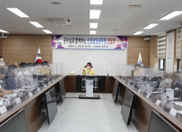 À̹ø °£´ãȸ´Â ´ë¹Î ÇàÁ¤¼ºñ½º¸¦ ó¸®ÇÏ´Â ¹Î¿ø´ã´ç °ø¹«¿øµéÀÇ °íÃæ°ú °ÇÀÇ»çÇ×, ¹Î¿ø Çö¾È¿¡ ´ëÇÑ ÀÚÀ¯·Î¿î ´ëÈÀÇ ÀåÀ» ¿±â À§ÇØ ¸¶·ÃµÈ ÀÚ¸®·Î À̵¿Áø Áøµµ±º¼ö¿Í ±ºÃ» ¹Î¿øºÀ»ç°ú, À¾.¸é ¹Î¿ø½Ç¿¡ ±Ù¹«ÇÏ´Â ¹Î¿ø´ã´ç °ø¹«¿ø 20¿©¸íÀÌ Âü¼®Çß´Ù.