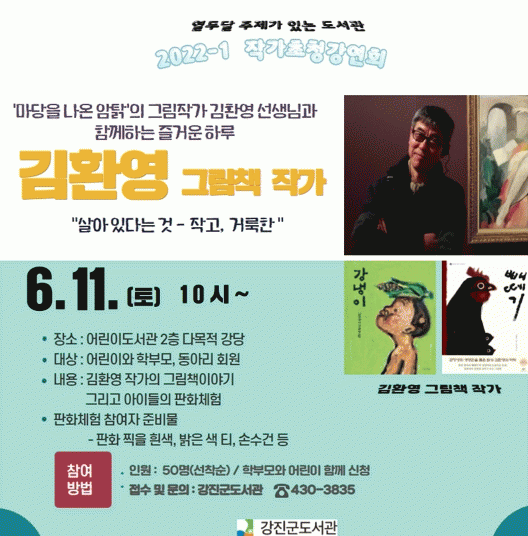 À̹ø ÀÛ°¡ÃÊû°¿¬È¸´Â ¡®¿µÎ´Þ ÁÖÁ¦°¡ ÀÖ´Â µµ¼°ü¡¯ ÇÁ·Î±×·¥ÀÇ ÀÏȯÀ¸·Î 6¿ùÀÇ ÆòÈ¿Í °ü·ÃµÈ ±èȯ¿µ ÀÛ°¡ÀÇ ±×¸²Ã¥À» Áß½ÉÀ¸·Î ¡®»ì¾ÆÀÖ´Ù´Â °Í-ÀÛ°í, °Å·èÇÑ¡¯À» ÁÖÁ¦·Î ÁøÇàµÈ´Ù.