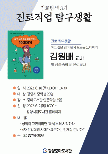 3±â ÇÁ·Î±×·¥ÀÇ 1°Àº Áø·Î ޱ¸»ýȰ·Î, 'ÇÏ°í ½ÍÀº °ÍÀÌ ¹ºÁö ¸ð¸£´Â 10´ë¿¡°Ô'ÀÇ ÀúÀÚ·Î úÞ ÀåÃæÁßÇб³ Áø·Î±³À°ºÎÀåÀÌÀÚ Ä¿¸®¾î³Ý »çÀ̹ö »ó´ãÀ§¿øÀÎ ±è¿ø¹è ÀÛ°¡¸¦ ÃÊÃ»ÇØ 4Â÷ »ê¾÷Çõ¸í ½Ã´ë°¡ ¿ä±¸ÇÏ´Â ÀÎÀç·Î ¼ºÀåÇϱâ À§ÇÑ ¿Ã¹Ù¸¥ ÇнÀ ½À°ü°ú Áø·Î µ¶¼¹ýÀ» ¹è¿ï ¿¹Á¤ÀÌ´Ù.